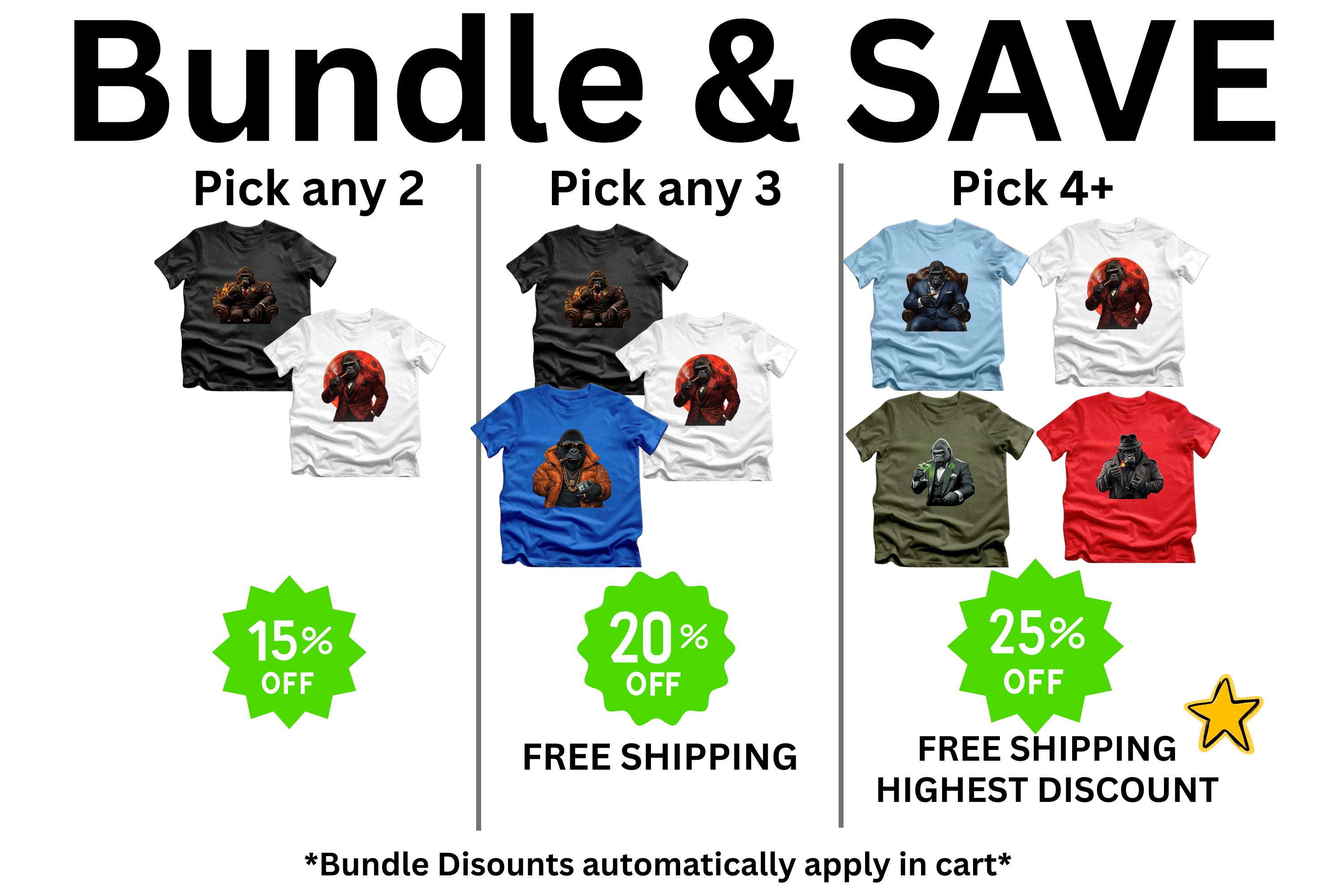 T-shirt featuring a samurai gorilla design, paired with jeans and boots on a wooden background.